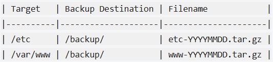 | 毎日 | 設定ファイル(/etc)のフルバックアップ | 7日分 | 深夜3:00 |
