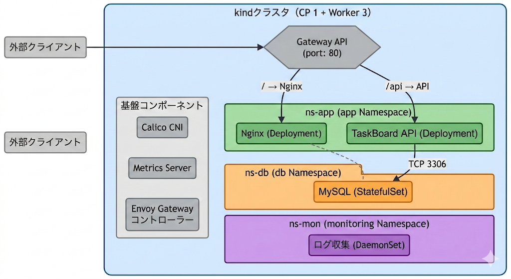 「TaskBoardはkindクラスタ上で動いています。クラスタはControl Plane 1台とWorker 3台で構成されています。アプリケーションは3つのNamespaceに分離しています。appにはフロントエンドとAPIサーバー、dbにはMySQLデータベース、monitoringにはログ収集の仕組みがあります。外部からのアクセスはGateway APIの80番ポートに集約し、パスでフロントエンドとAPIに振り分けています。APIからDBへの通信はありますが、フロントエンドからDBへの直接通信はNetworkPolicyで遮断しています。」