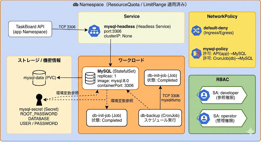 | db Namespace図 | Level 2 | MySQL StatefulSet、Headless Service、PVC、Job、CronJob、Secret |