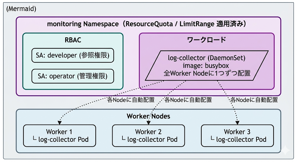 本番ではFluentdやFluent Bitを使用しますが、応用編ではbusyboxによる簡易実装です。ResourceQuotaとLimitRangeが適用され、RBACでServiceAccount(developer / operator)が設定されています。