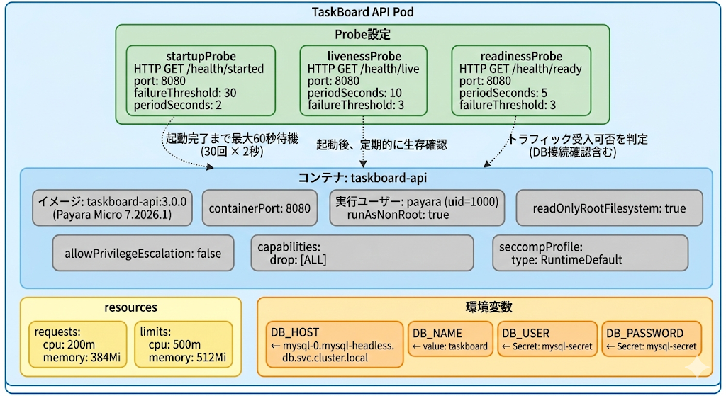TaskBoard API PodはPayara Micro 7.2026.1ベースのコンテナを1つ含み、8080番ポートでリッスンします。実行ユーザーはpayara(uid=1000)で、非rootです。SecurityContextで権限昇格を禁止(allowPrivilegeEscalation: false)し、capabilitiesをすべて剥奪し、ルートファイルシステムを読み取り専用に設定し、seccompProfile(RuntimeDefault)でシステムコールを制限しています。